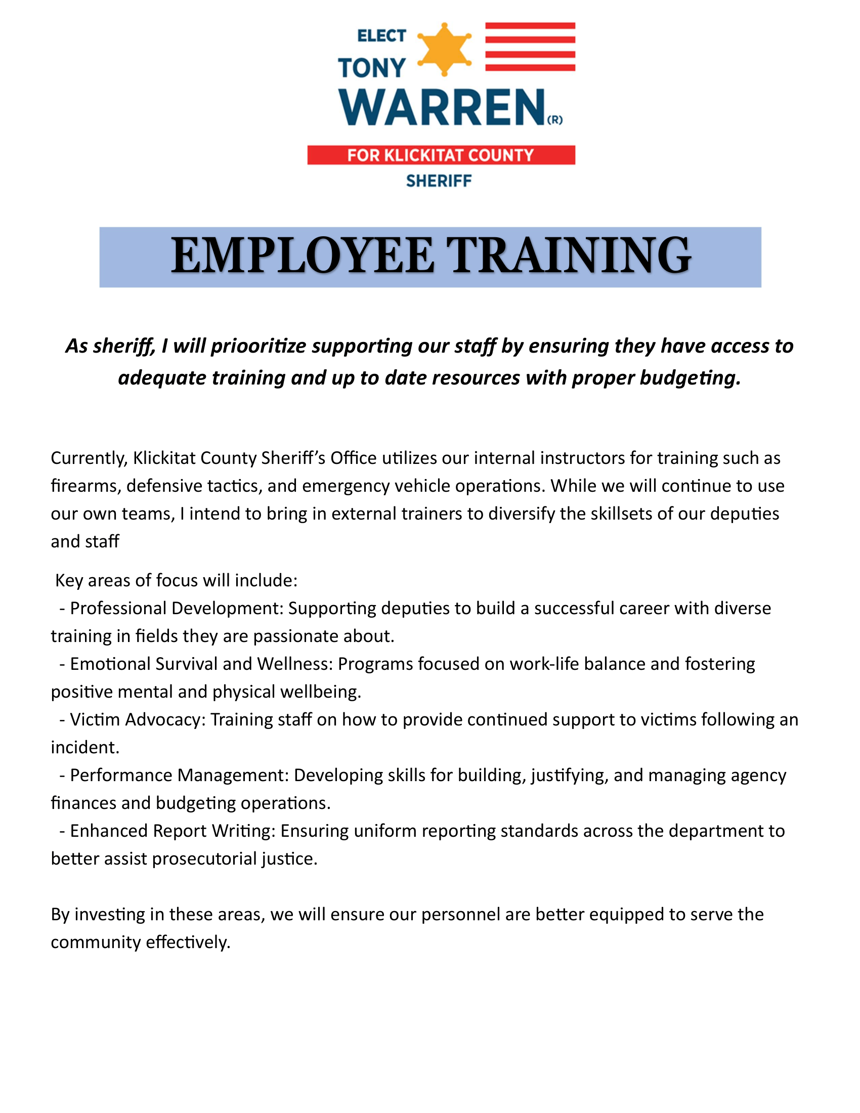 Law enforcement professionals are the backbone of public safety. As Sheriff, Tony will prioritize ensuring our deputies have access to adequate training, modern equipment, and the resources necessary to protect our community effectively and safely. Supporting those who serve means investing in their wellness, professional development, and operational readiness.