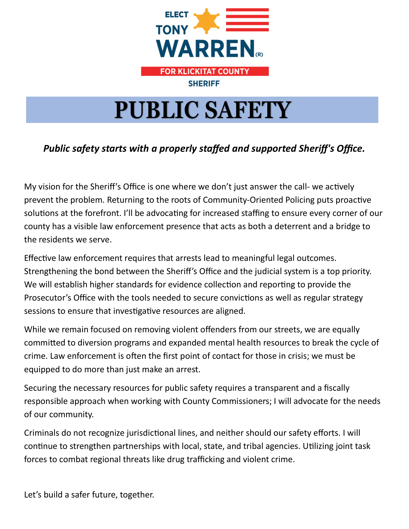 Tony believes in fostering an environment of trust that is earned and upholding the highest ethical standards — for himself and the office alike. He vows to protect and respect the constitutional rights of every individual, ensuring equal treatment regardless of race, gender, religion, or socioeconomic status. Tony will strengthen our resources and department to ensure adequate response and address evolving challenges like drug enforcement, property crime, and traffic safety.